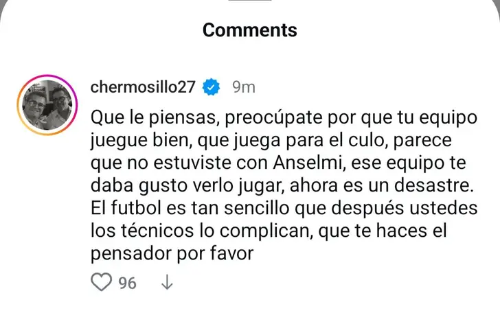 El charrúa no convence al Gigante de Cerro Azul ni su estilo de juego y mucho menos la poca autocritica que tiene. Es por eso, que aprovechó las redes sociales para hacerle llegar un mensaje a Vicente Sánchez en su Instagram, en el que le pidió que se ponga a trabajar porque su equipo no juega a nada y feo.