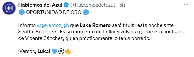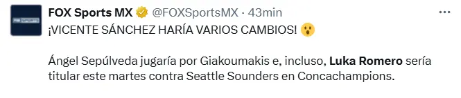 Ante Seattle Sounders va a la banca y veremos cuántos minutos le dará Vicente Sánchez a Luka Romero, que eso dependerá de la necesidad que tenga en el marcador, pero algo es seguro, no cuenta con él.