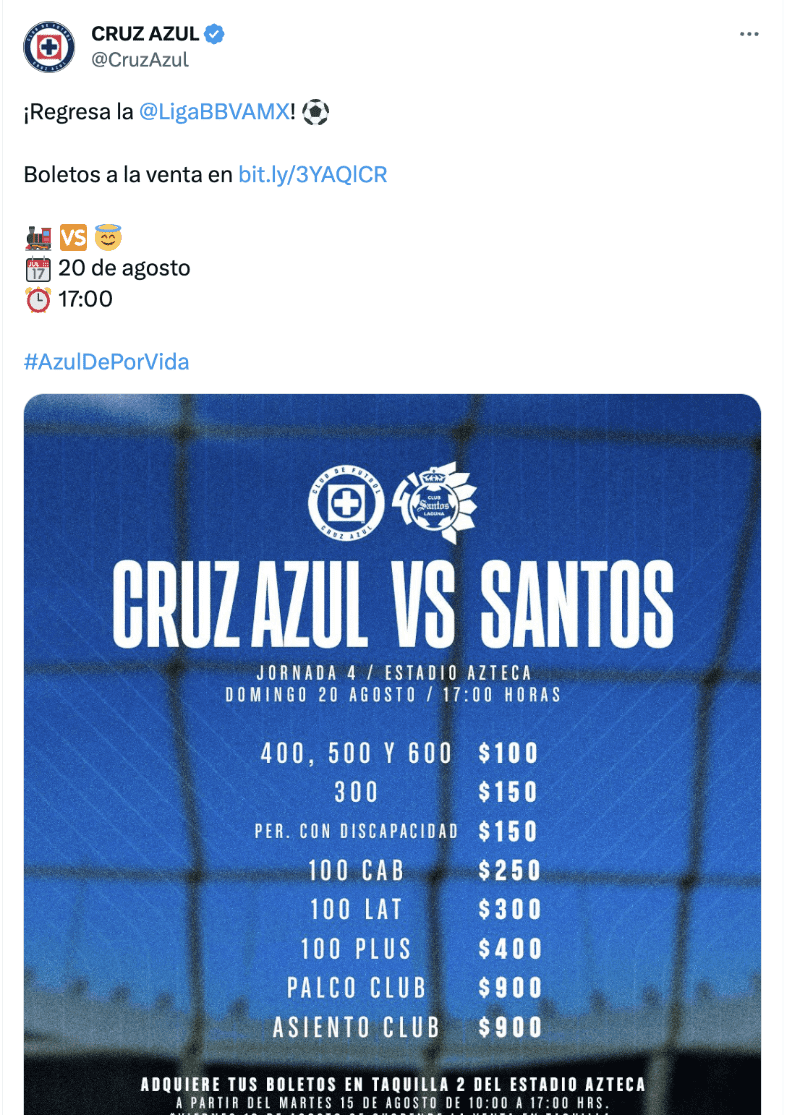 A través de sus redes sociales, Cruz Azul presentó el listado de precios que propuso para el cotejo ante el cuadro lagunero, el mismo que presentó molestias por parte de los aficionados que sienten que el equipo no entra en armonía con la afición y prefiere cobrar precios excesivos. Desde 100 a 900 pesos son los precios que dispuso la Máquina Celeste.